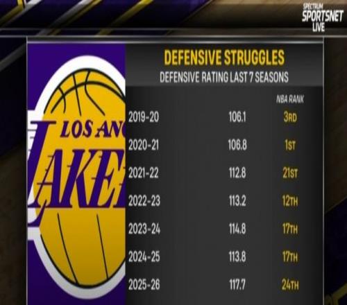 湖人主场迎战灰熊前,赛前转播方给出了湖人过去7个赛季的防守效率排名。19-20的夺冠赛季,湖人排名第3,随后20-21赛季排名第一,本赛季排名联盟第24,是近7年来最低的存在。转播方的主持人对此表示,湖人管理层一直想要在交易截止日前搞来一名防守悍将,此前他们将热火的维金斯以及鹈鹕的琼斯视为头号目标,但是热火本赛季的战绩不错,无意兜售威金斯,而琼斯遭遇伤病,湖人将引援目标锁定在太阳的狄龙布鲁克斯身上。