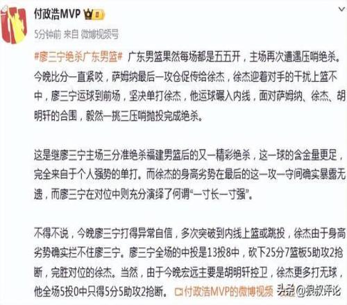 广东男篮果然每场都是五五开,主场再次遭遇压哨绝杀。今晚比分一直紧咬,萨姆纳最后一攻仓促传给徐杰,徐杰迎着对手的干扰上篮不中,廖三宁运球到前场,坚决单打徐杰,他运球碾入内线,面对萨姆纳、徐杰、胡明轩的合围,毅然一挑三压哨抛投完成绝杀。”
